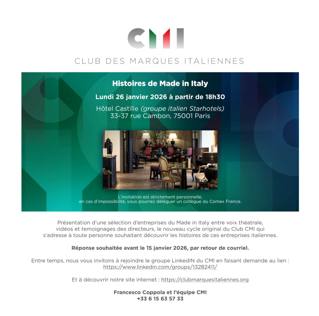 Restez informé des dernières initiatives, événements et actualités du Club des Marques Italiennes. Découvrez nos rencontres exclusives, ateliers et opportunités de networking pour promouvoir le Made in Italy en France.